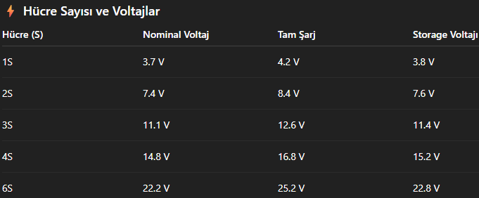 Storage voltajı: Hücre başına ~3.8V — saklamadan önce mutlaka yapılmalı